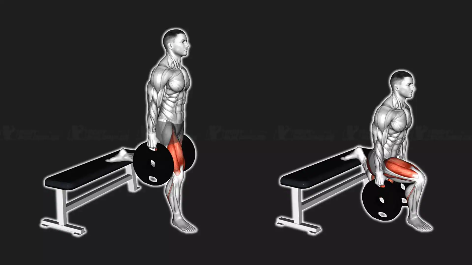 Übungstyp: Bulgarian Split Squat Gewichtsscheiben ist eine einbeinige Kniebeuge mit erhöhtem hinterem Bein und Fokus auf einseitigen Beinaufbau.