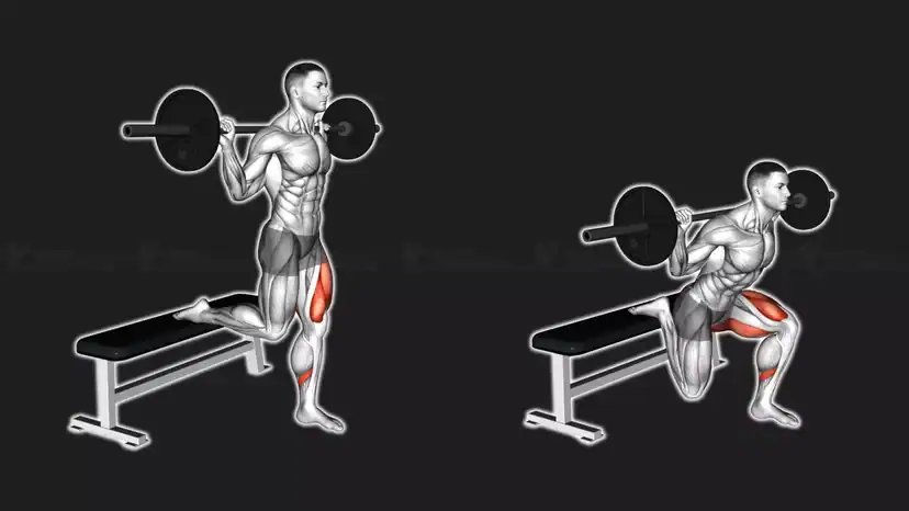 Übungstyp: Bulgarian Split Squat Langhantel ist eine einbeinige Kniebeuge mit erhöhtem hinterem Bein und Fokus auf einseitigem Beintraining.