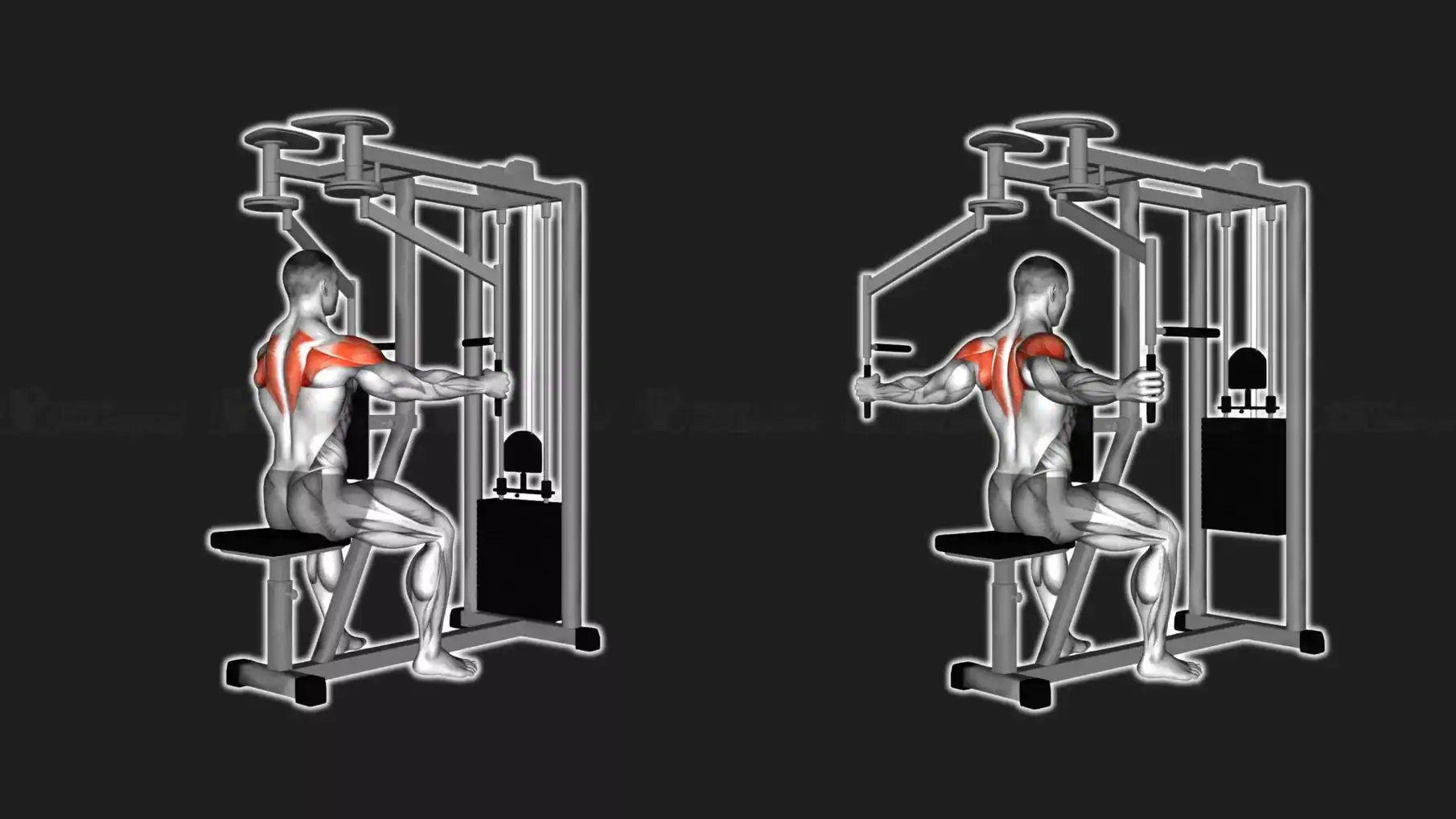 Ziel: Butterfly Reverse am Gerät Parallel fördert den Trapezmuskel und den hinteren Deltamuskel und unterstützt von Rhomboiden, Infraspinatus und Teres minor.