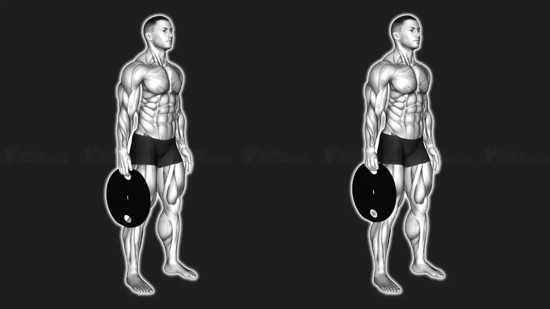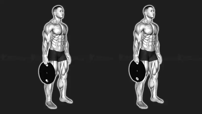 Stehe aufrecht und stabil, während du die Gewichtsscheibe seitlich neben deinem Körper hältst. Deine Schultern bleiben tief, die Brust ist leicht angehoben und dein Blick zeigt nach vorn. Halte den Oberarm ruhig, spanne deine Körpermitte an und vermeide jede Schwungbewegung. Das Handgelenk bleibt kontrolliert, damit die Belastung gezielt auf Fingerbeuger und Handbeuger geht und nicht durch eine unsaubere Haltung verloren geht.