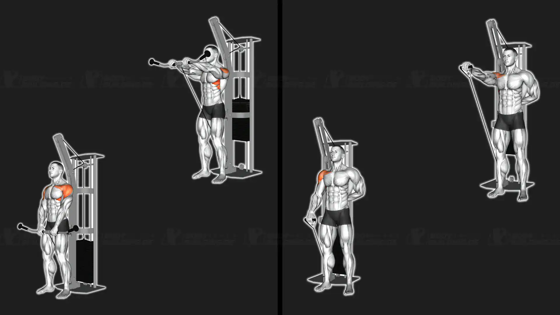 Ziel: Frontheben Kabelzug, Kabelzug beidarmig, Kabelzug einarmig fördert den vorderen Deltamuskel und wird unterstützt von mittlerem Deltamuskel, hinterem Deltamuskel und Trapezmuskel.